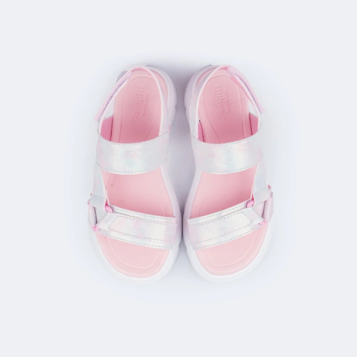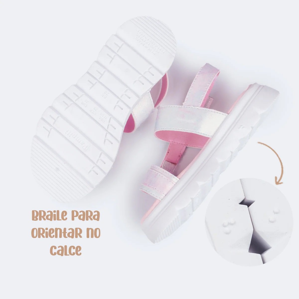 Pensando na autonomia, o calce fácil com fecho de contato no calcanhar, proporciona praticidade para calçar. Além disso, o solado traz identificação em braile, valorizando a inclusão de meninas cegas ou com baixa visão.